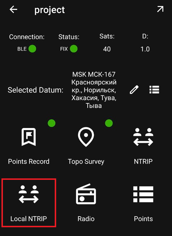 Режим Local NTRIP активируется в настройках проекта. Откройте существующий проект или создайте новый в разделе Projects - опция Local NTRIP появится автоматически.
