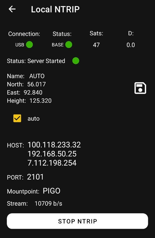 Чтобы начать передачу поправок нажмите “start NTRIP”.