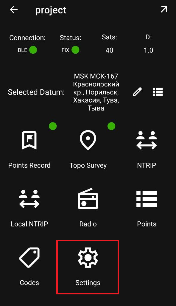 - Настройки: масштабирование карты, фокусировка камеры на точке и отображение базовых станций.