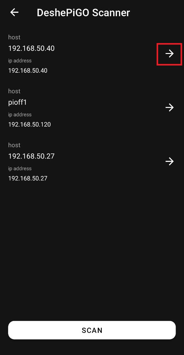 В разделе "DeshePiGO Scanner" вы сможете обнаружить приемники DeshePiGO и подключиться к ним. При нажатии кнопки, выделенной на скриншоте, вы будете перенаправлены на веб-интерфейс DeshePiGO. Как работать с приёмниками DeshePiGO, читайте в статье "Быстрый старт!".