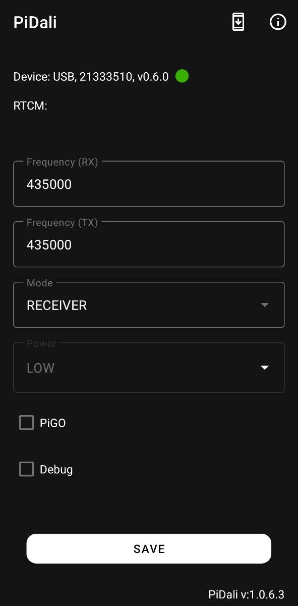 3. Настройте приставку PiDali на приём с помощью приложения. Установите соединение с устройством и выберите настройку Mode (RECEIVER), как показано на скриншоте. Сохраните выбранные настройки.